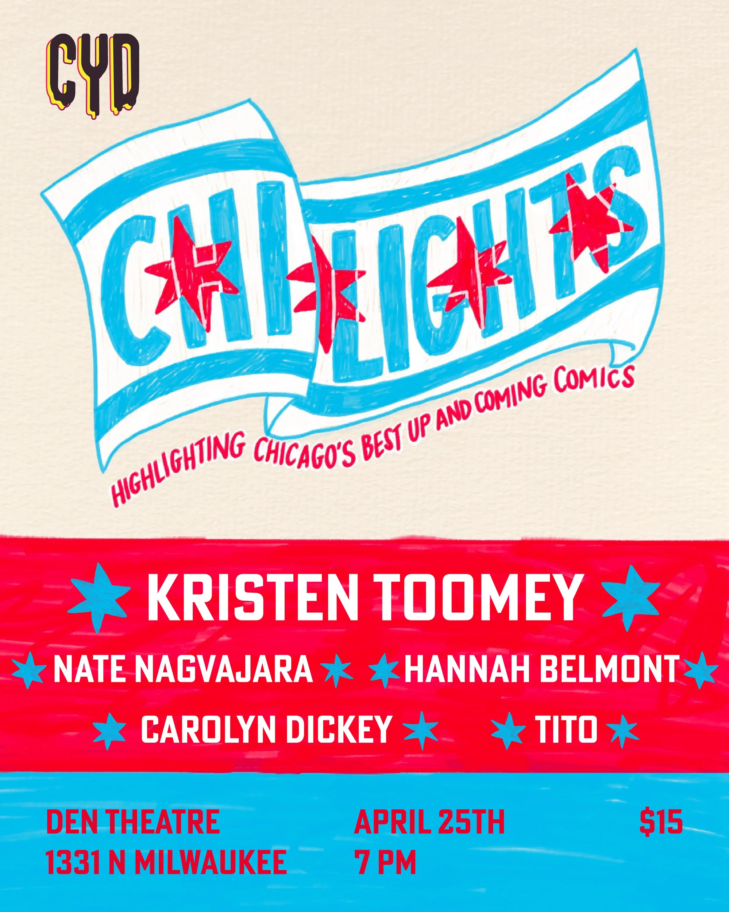 The Den Theatre and comedy club is pleased to host Comedy You Deserve: Chi-Lights on April 25, 2026 at 1331 N. Milwaukee Ave. in Chicago’s Wicker Park neighborhood.